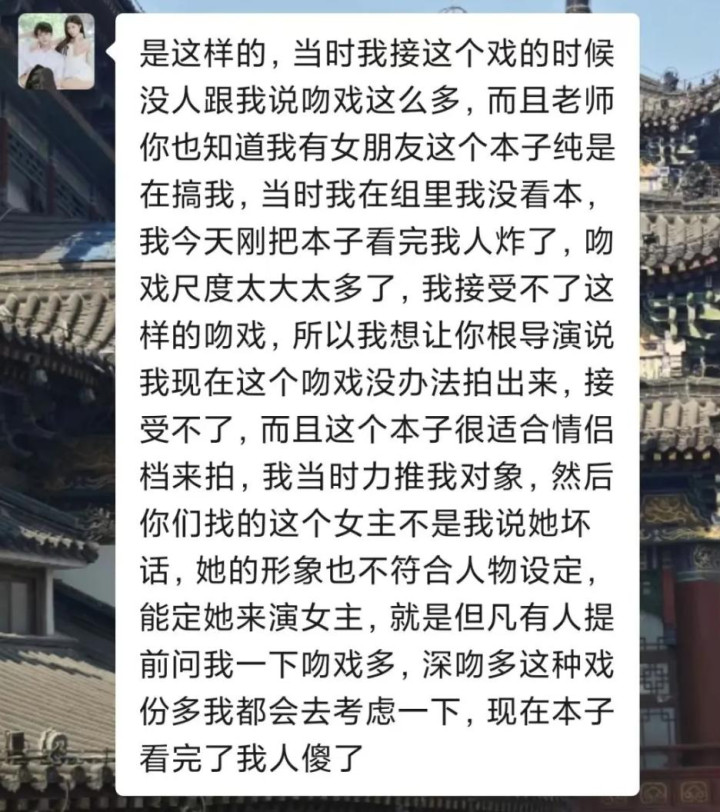 他表示,自己在心理压力很大的情况下,做出了擅自离组的行为,他对此深表歉意。但他也称,自己并非不接受吻戏,而是这个剧本中的吻戏超出了他的接受范围。
