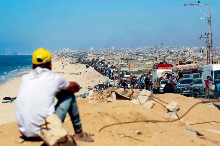 连接加沙南北的主要海滨大道拉希德街两侧,尽是废墟和残骸。母亲们抱着孩子,老人由亲友搀扶,孩子们顶着包袱前行。塞满了床垫和家具的面包车陷在人流中。大多数人不知道自己要去哪里,只是盲目前行。